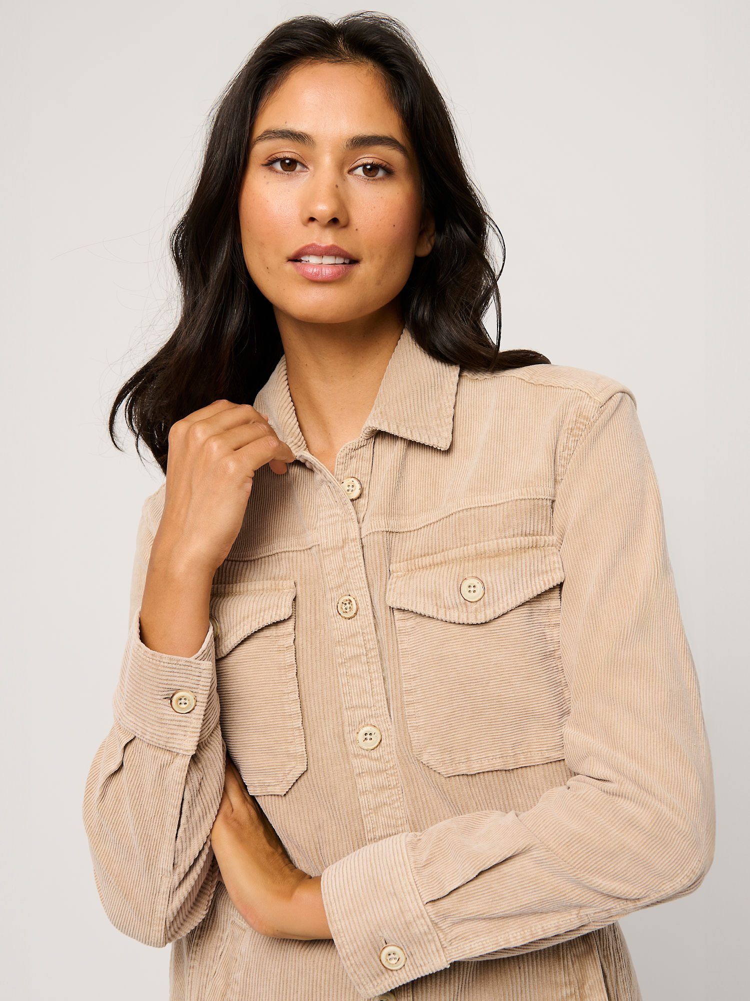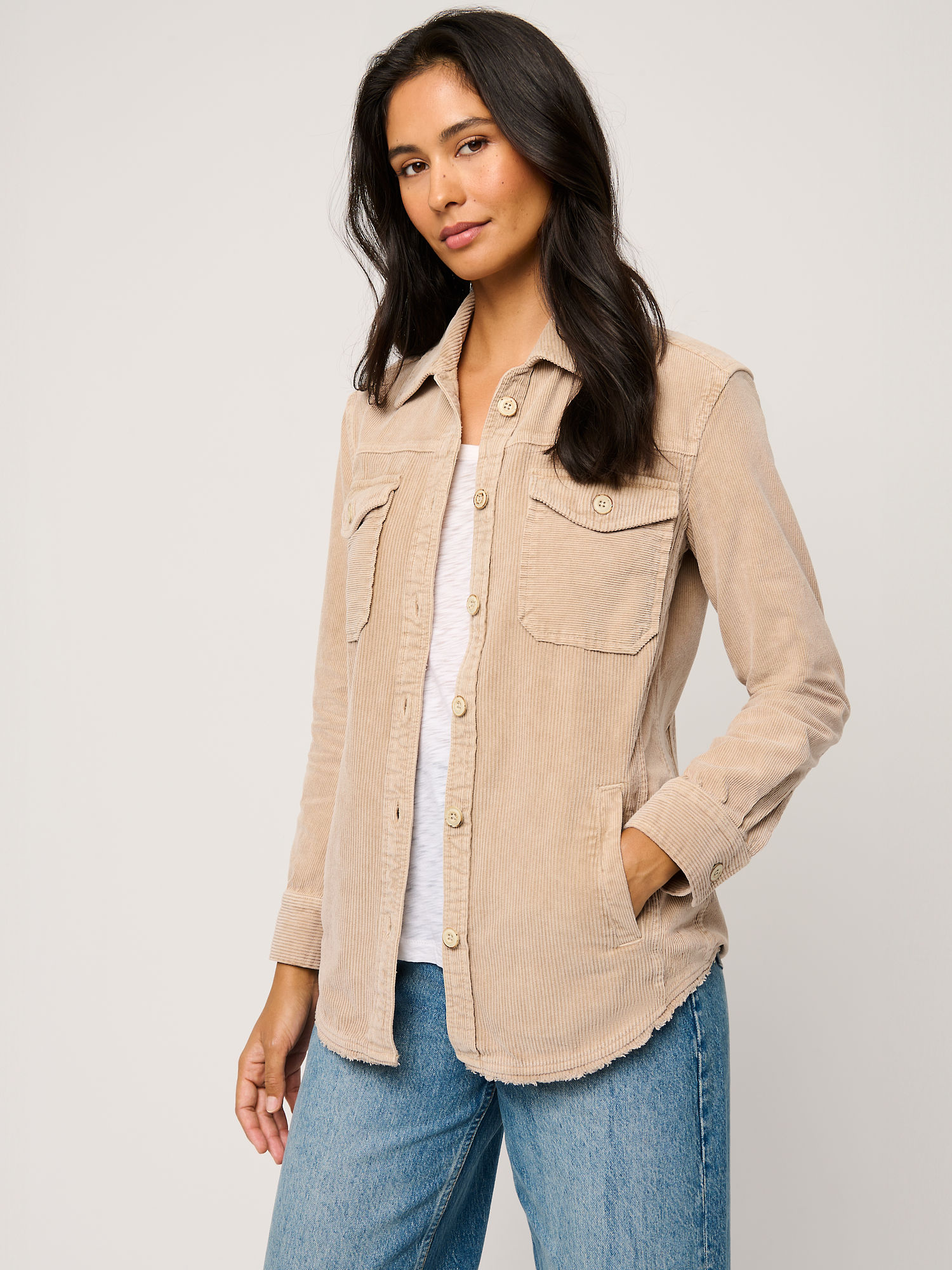 The neutral, earthy tone of the corduroy adds to its timeless appeal, making it easy to coordinate with your existing wardrobe staples. Its textured surface and rich hue lend an authentic, rugged charm that pairs well with denim, khakis, or even casual skirts, making it an adaptable piece for various occasions.